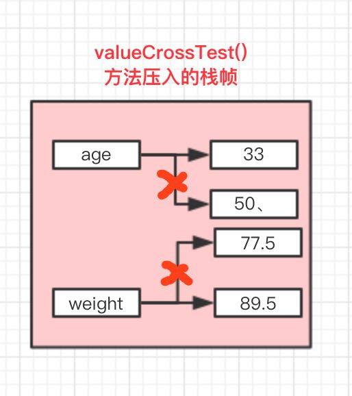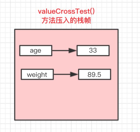 而当执行到valueCrossTest()方法时,JVM也为其往虚拟机栈中压入一个栈,即为当前栈帧,用来存放valueCrossTest()中的局部变量等信息,因此age和weight是躺着valueCrossTest方法所在的栈帧中,而他们的值是从a和w的值copy了一份副本而得,如图: