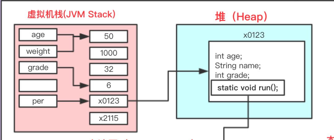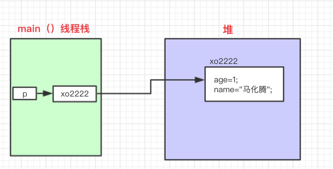 JVM会在堆内开辟一块内存,用来存储p对象的所有内容,同时在main()方法所在线程的栈区中创建一个引用p存储堆区中p对象的真实地址,如图: