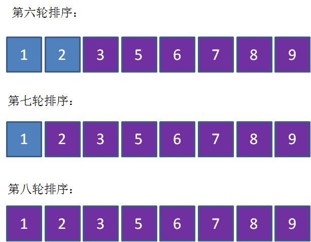 让我们回顾一下刚才描述的排序细节,仍然以5,8,6,3,9,2,1,7这个数列为例,当排序算法分别执行到第六、第七、第八轮的时候,数列状态如下: