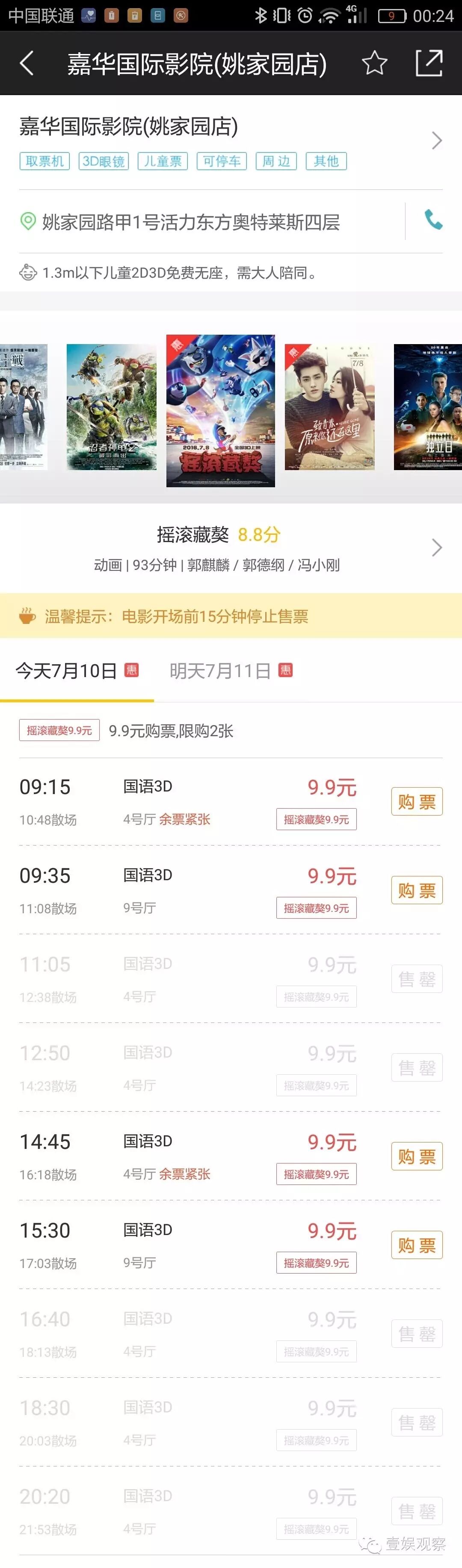 壹娱观察10日凌晨0:24同样通过微票儿查询了嘉华国际影城(姚家园店)10日《摇滚藏獒》的排片,当日从9:15到20:20共开出9场《摇滚藏獒》,显示11:05、12:50、16:40、18:30、20:20五场已售罄。