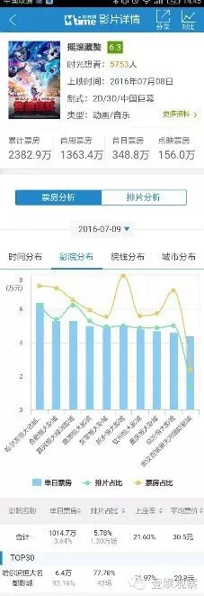 图8:7月9日《摇滚藏獒》排片影院分布(时光网专业版app)
