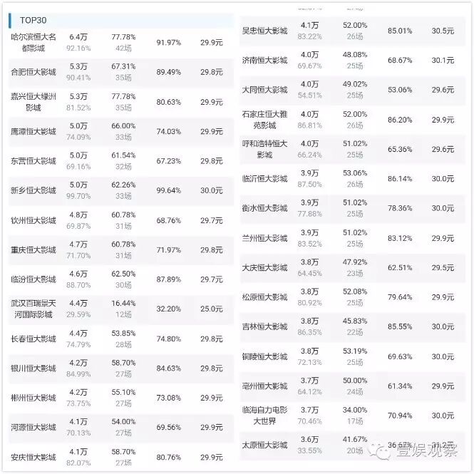 9日《摇滚藏獒》全国排片TO30的影院,恒大系影城占了28席,第一名的哈尔滨恒大名都影城排片占比达到77.78%,42场,上座率高达91.97%;该榜单里排片最少的恒大影城是太原恒大,排片占比41.67%,20场,上座率36.67%。