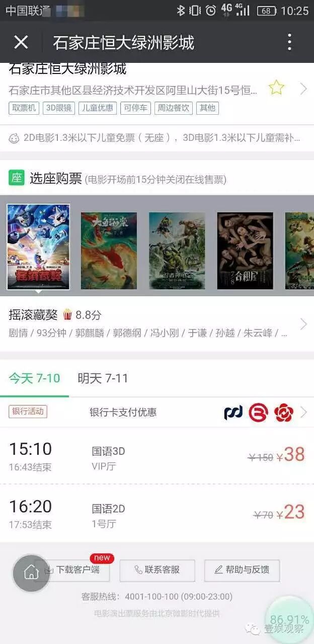 图13:7月10日上午10:25,石家庄恒大绿洲影城7月10日《摇滚藏獒》场次表(微票儿)