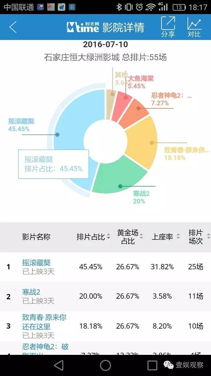 图14:7月10日下午18:17,石家庄恒大绿洲影城7月10日排片分布(时光网专业版app)