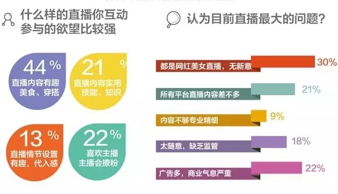 在投资人的眼中,内容升级将是现阶段直播行业的重点,红点创投主管合伙人袁文达在接受采访时表示,普通的直播缺乏内容策划,容易让用户产生无聊感,这是目前整个直播行业现在都面临的问题,“内容升级以及内容质量的比拼,会成为这一阶段的重点”。在腾讯时尚直播用户调查中,只有22%的网友会因为主播的原因参与直播互动,78%的网友都会更加注重直播内容的设置。