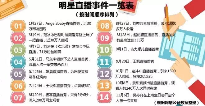 回顾这个时间表可以看出,从2016年开始,凡是具有一定话题热度的明星基本都被各家平台请去“直播首秀”,自带光环的明星的加入将原本难登大雅之堂的直播推入一个新的阶段,也将直播的观看人数,刷出一个又一个新的高峰。在腾讯时尚11月的直播用户调查中,网友票选出的“2016年印象最深刻的10大直播事件”,除了“杜蕾斯百人试套”活动,其余9个全部都与明星相关。