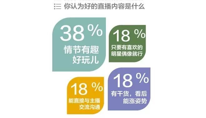 不断成长的直播观众也有了对内容成熟的评判准则,随着明星直播内容的过度泛滥,有趣、有料的直播内容成为他们选择直播内容的首要因素。在腾讯时尚11月所做的网友调查中,38%的网友认为,情节有趣好玩儿才是好的直播内容的关键。