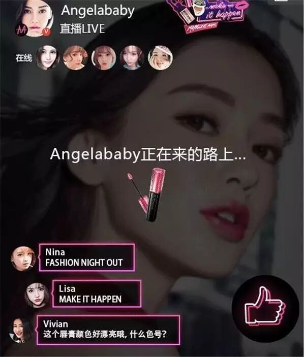 4月14日,Angelababy直播出席美宝莲新款口红发布会,销量转化率斐然,仅直播当天就卖出了10607支,刷新了电商平台彩妆唇部彩妆类目下的记录。69届戛纳国际电影节,李宇春在直播中使用的巴黎欧莱雅同款唇膏,也在直播结束4小时候,全部售罄。
