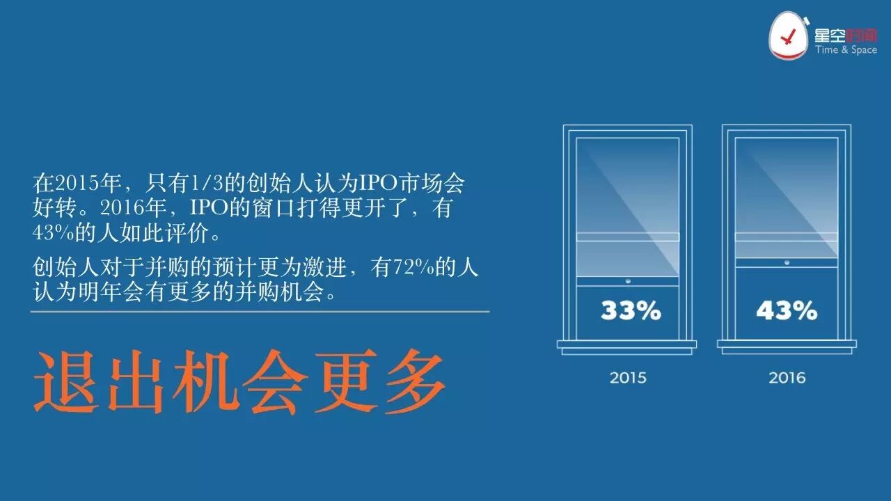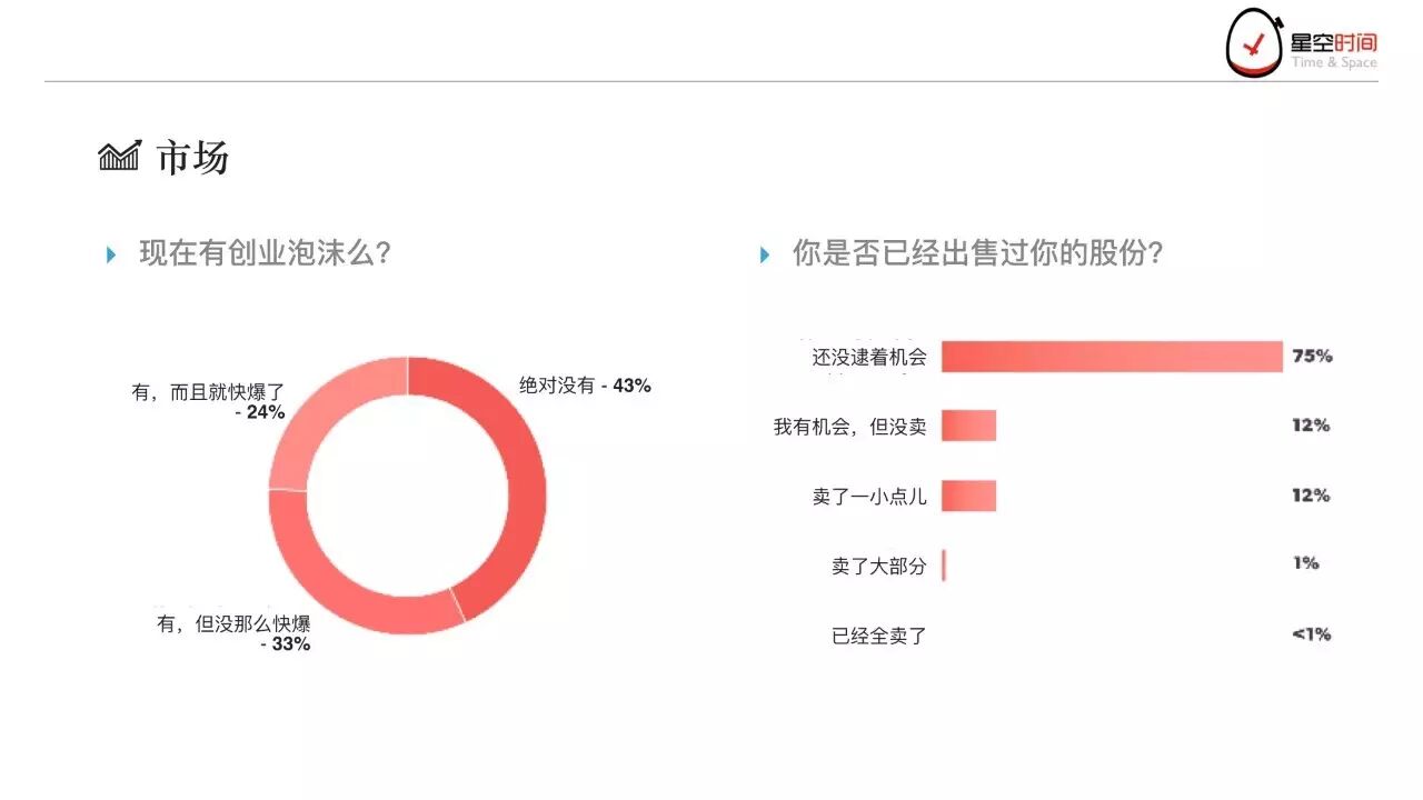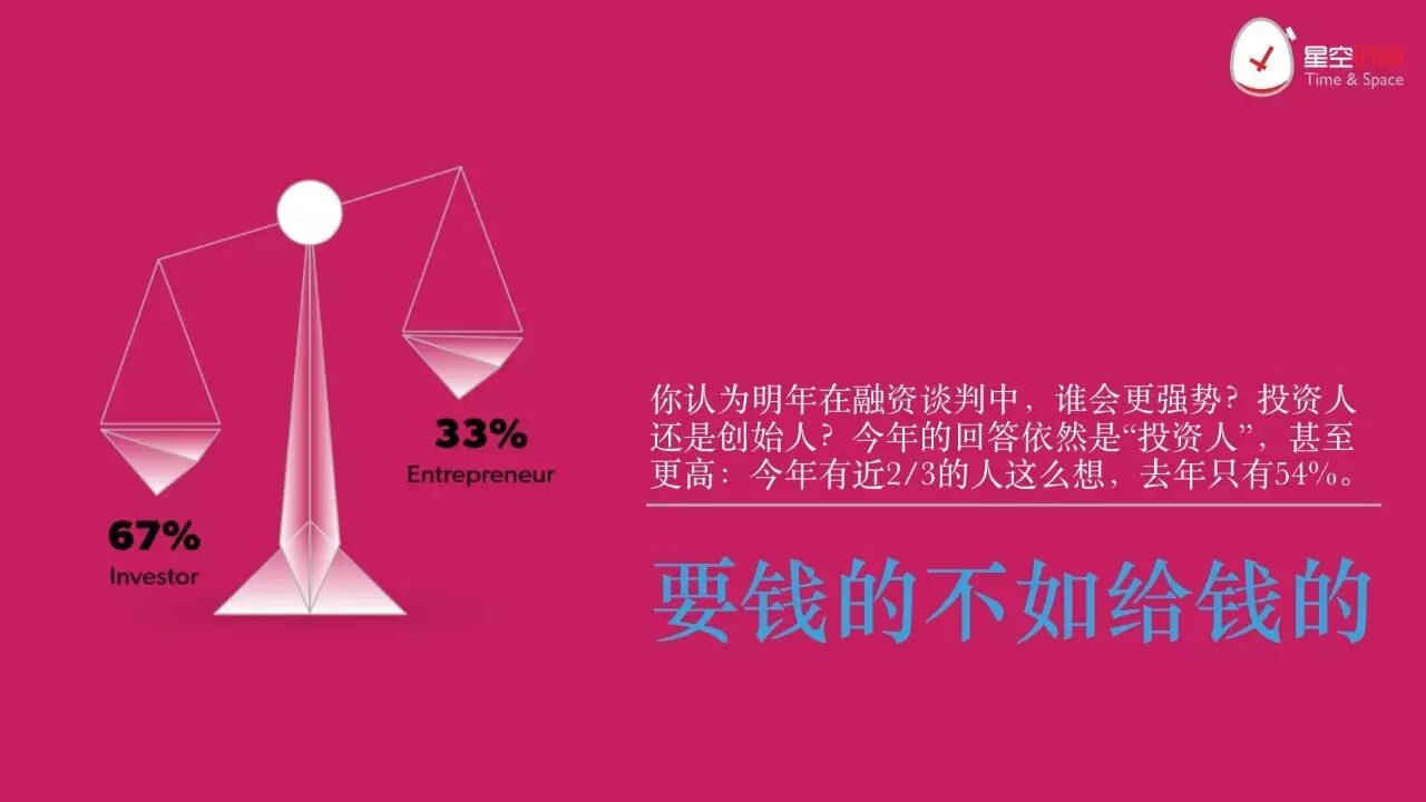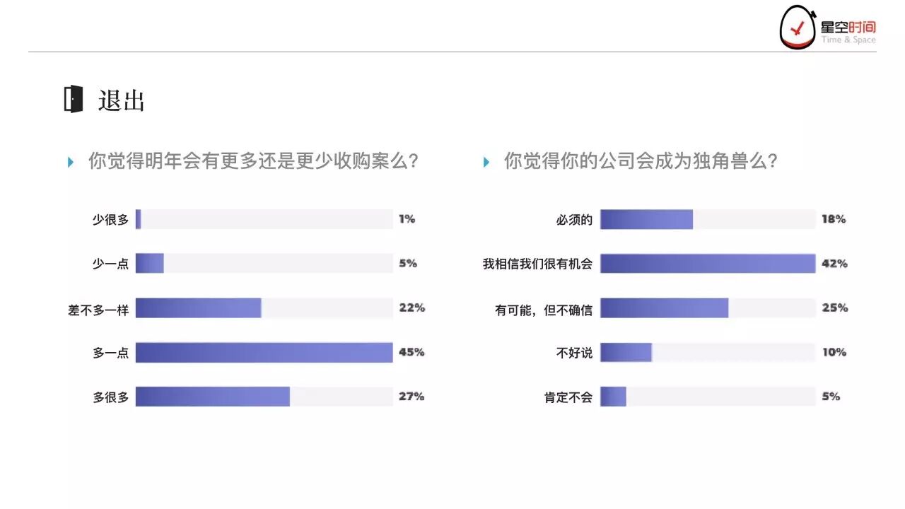 但是,91%的调查对象认为现在正是创业的好时机,18%的调查对象认为自己的公司会成为独角兽,72%的调查对象认为明年会有更多的并购机会。