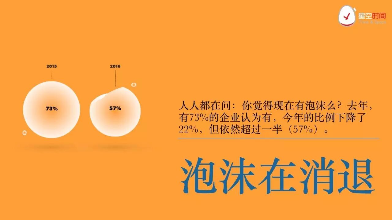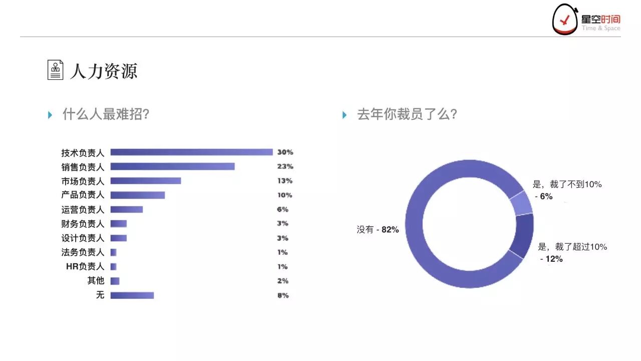 艰难也要保持乐观。报告显示,18%的调查对象在去年进行过裁员,57%的调查对象认为现在有泡沫,67%的调查对象认为未来一年投资人更有话语权,45%的调查对象认为未来一年更难融资。
