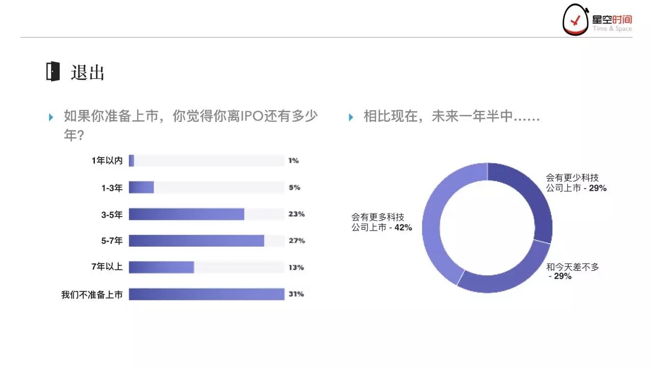 未来独角兽们,请保持乐观。42%的调查对象认为相比现在,未来一年半中“会有更多的科技公司上市,50%的公司认为自己如果准备上市,距离IPO还有2-7年。