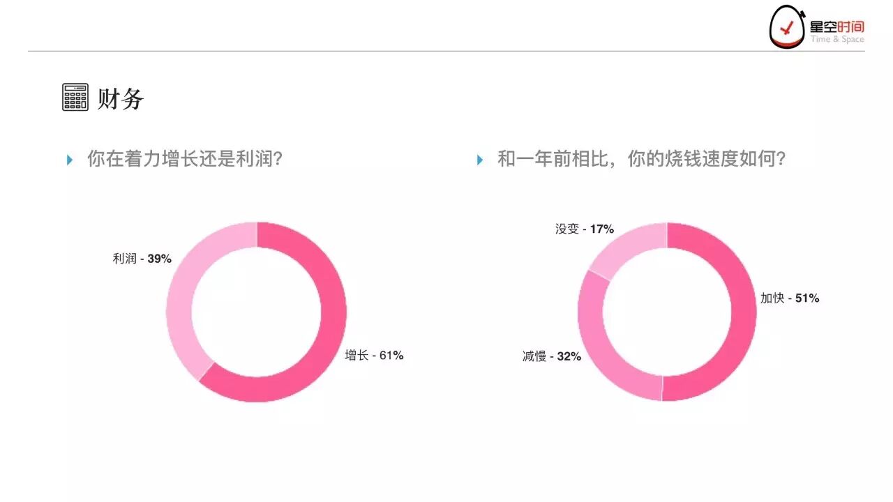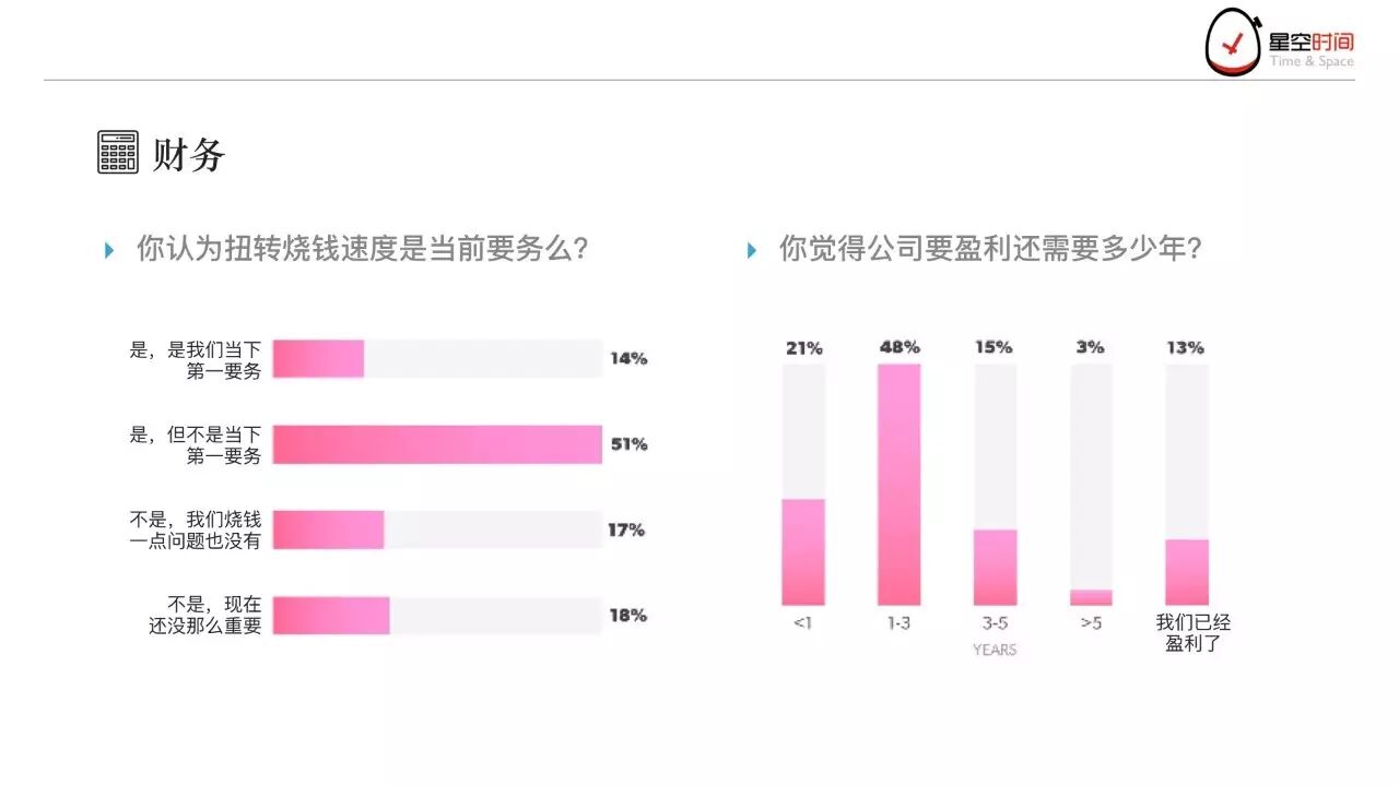 小目标是三年内实现盈利。51%的企业和一年前相比,烧钱速度在加快,48%公司要盈利还需要1-3年。而51%的调查对象认为扭转烧钱速度是当前要务、但不是当下第一要务。