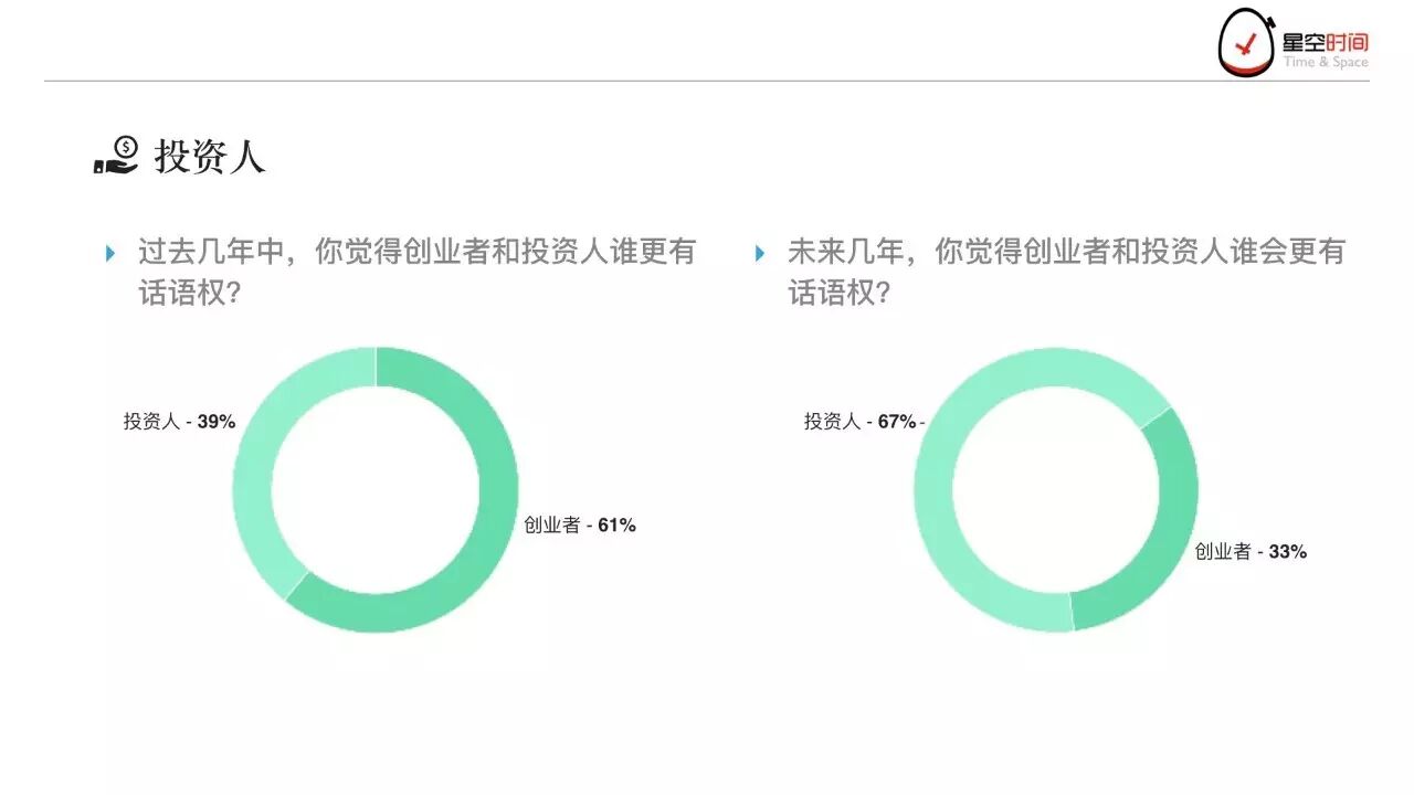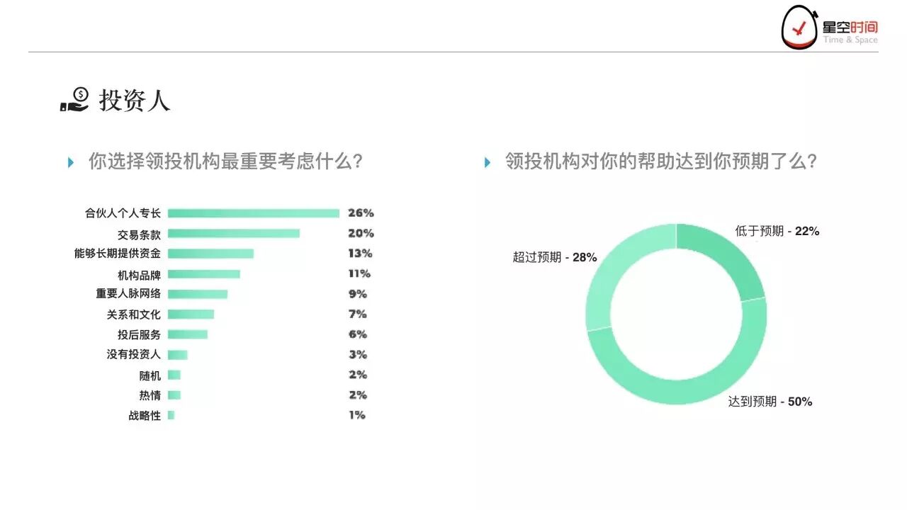 投资人将会更有话语权。61%的调查对象认为,过去几年中创业者比投资人更有话语权;而67%的调查对象认为未来几年投资人比创业者更有话语权。在选择领投机构时,多数调查对象会考虑“合伙人个人专长”以及“交易条款”。