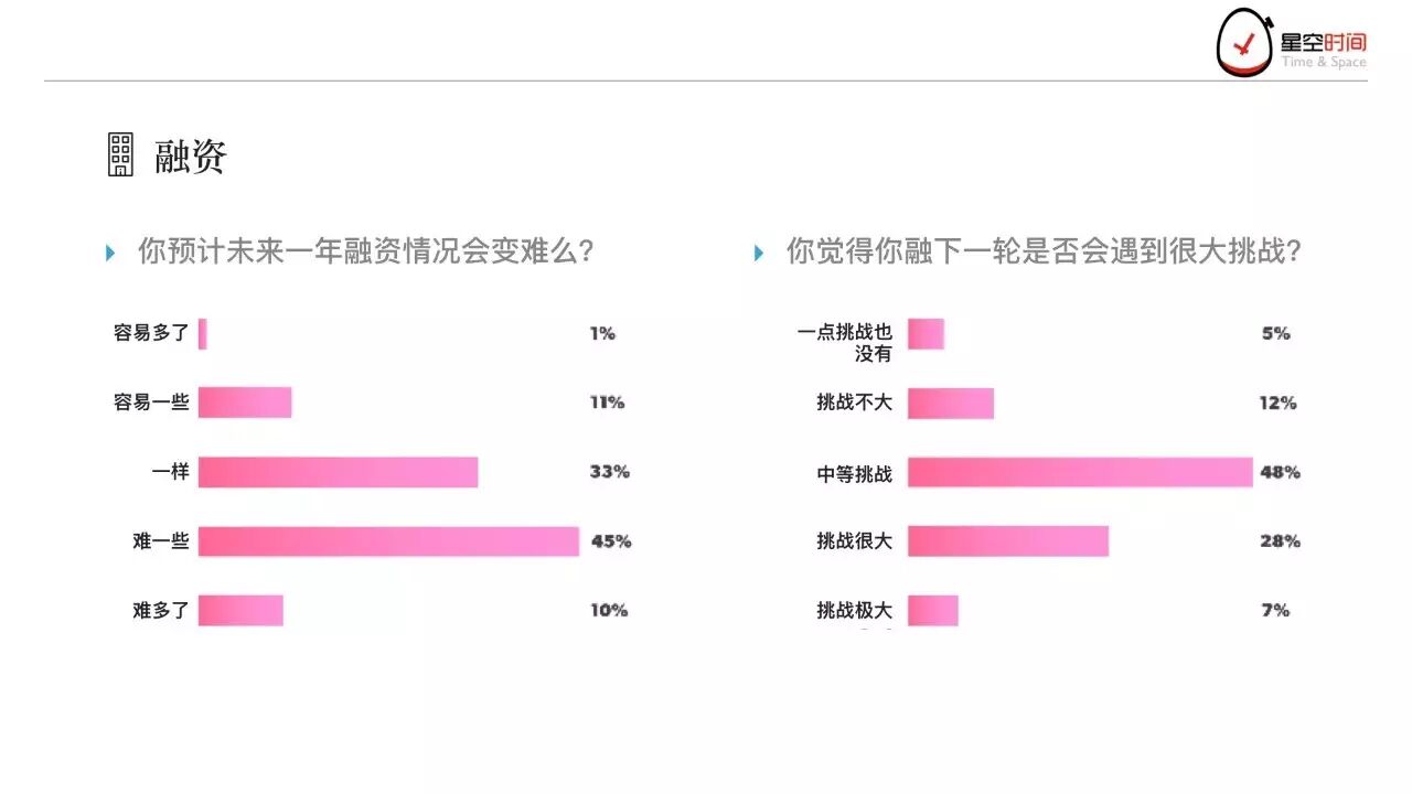 45%调查对象预计未来一年融资情况会“难一些”,48%认为融下一轮会遇到“中等挑战”。