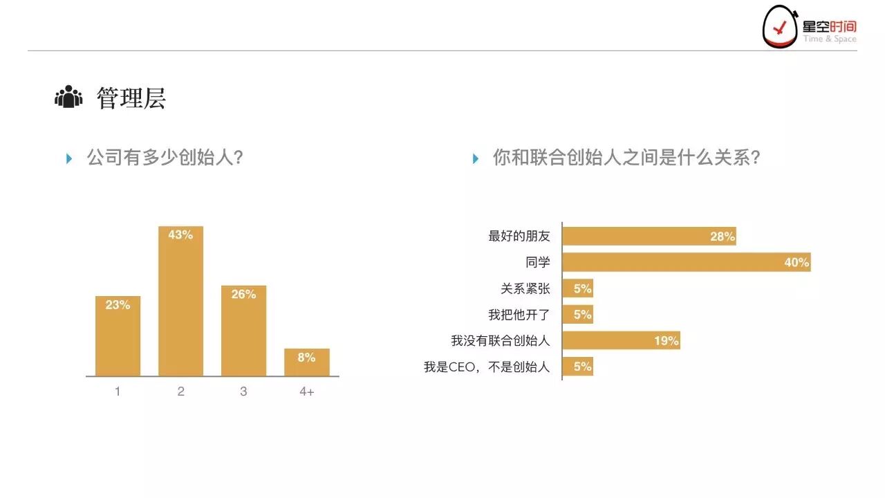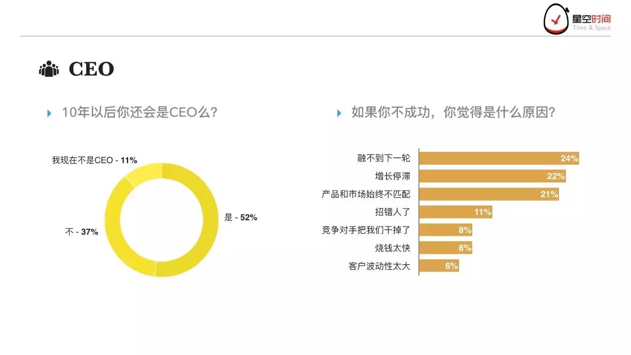 好伙伴,才能一起创业。43%的公司有2名创始人,多数的调查对象与联合创始人之间是同学或者最好的朋友。过半数的调查对象认为自己10年以后仍会是CEO,“融不到下一轮”、“增长停滞”、“产品与市场始终不匹配”成为调查对象们认为无法成功的重要几个原因。