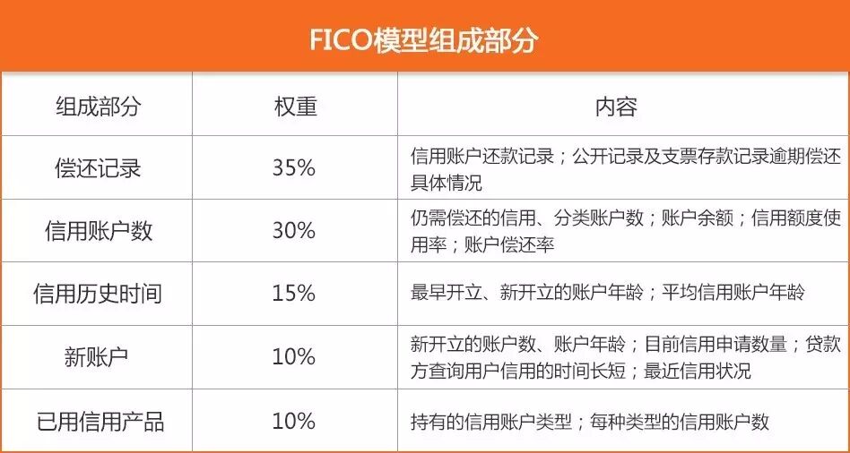FICO模型由五部分组成,包括用户付款记录、信用账户数、信用历史期限、新开账户和已用信用产品,各部分在计算评分中分别占比35%、30%、15%、10%、10%。FICO得出的信用分数范围为300-850,分数越高,代表用户信用风险越小。