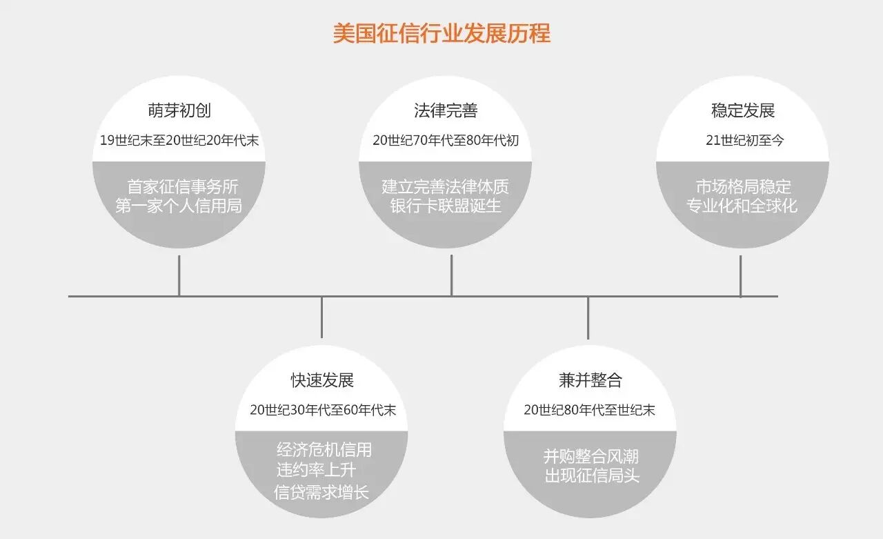 美国征信行业现在已经形成了成熟完备的运作模式、法律体系和监管机制,其发展大体经过了萌芽初创、快速发展、法律完善、兼并整合、稳定发展等五个阶段。