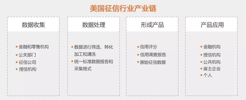 美国征信行业产业链也已经发展到完善的阶段,主要包括数据收集、数据处理、形成产品和产品应用四个环节,其中,数据处理和形成产品是关键环节。