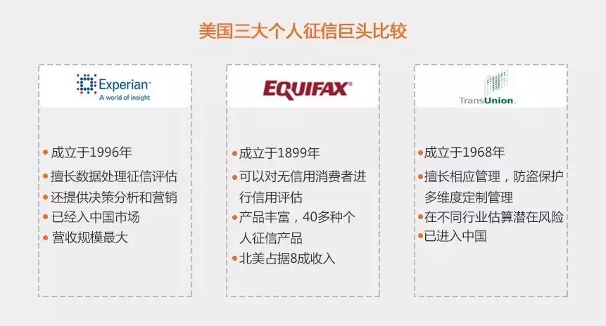 而在个人征信行业,则以Experian(益博睿)、Equifax(艾可菲)、Trans Union(全联)为核心,三大征信机构之间既相互合作又凭借各自的产品差异形成竞争,其余400多家区域性或专业性机构都是依附于这些机构,或者向其提供数据。1980年前后,这三大个人征信巨头已经完成了美国成年人口的全覆盖。