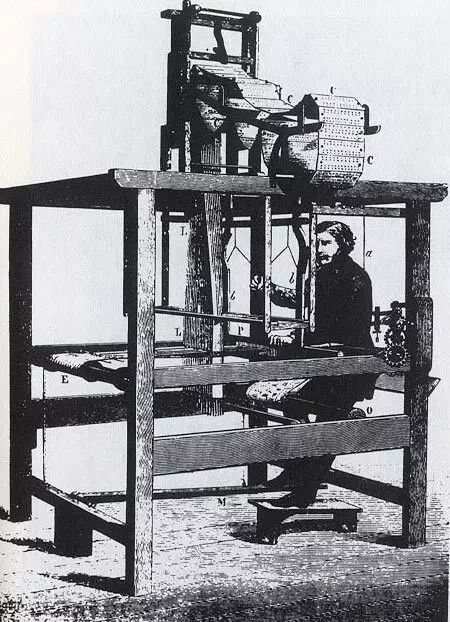 1804 年,法国人 Joseph Marie Jacquard 给织布动作赋予数字。打孔卡片的每个孔对应一个钩子,通过控制钩子上的线的走向,自动织出图案。