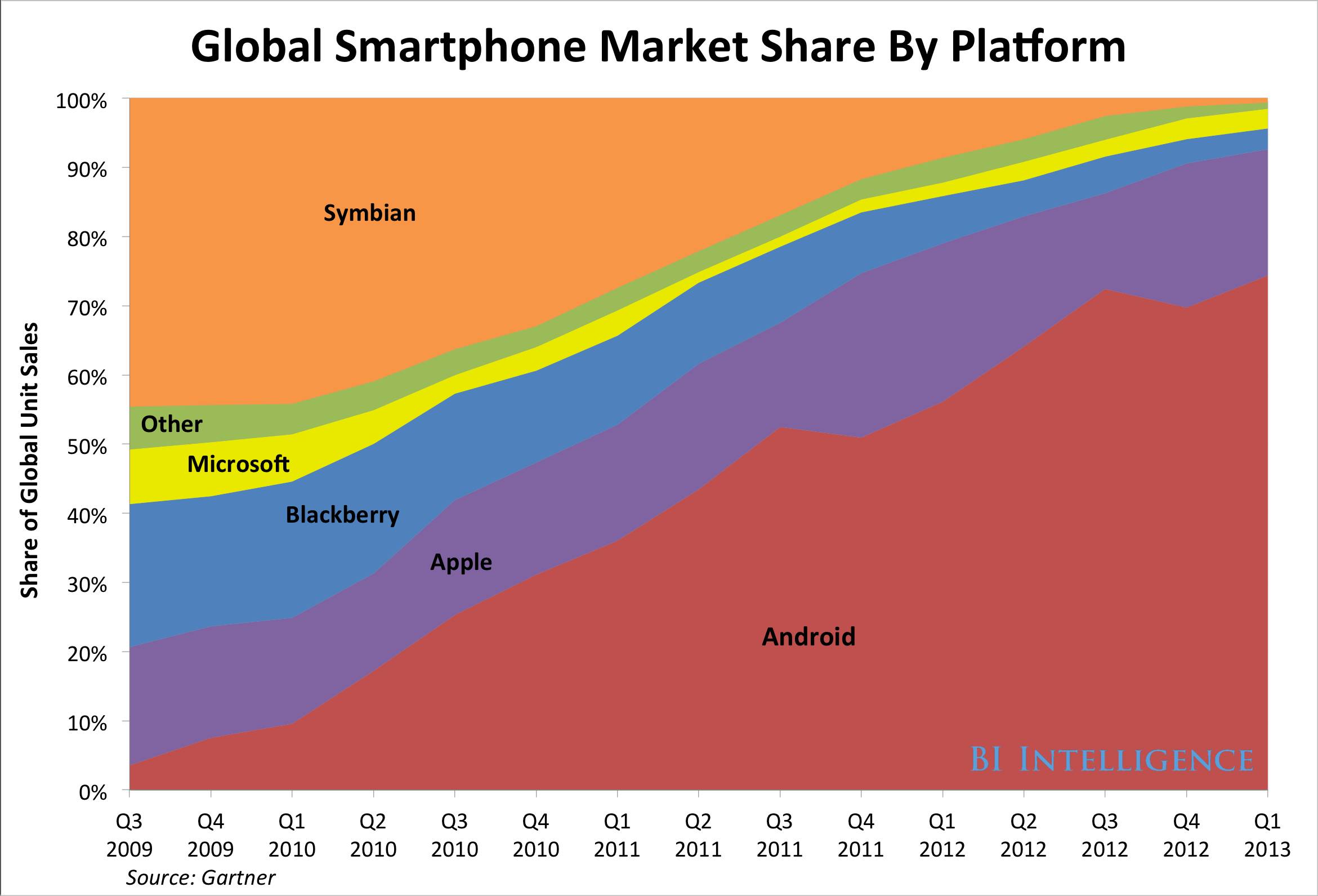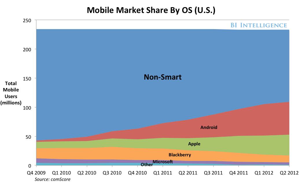 (上图)初期,Apple、Blackberry 等高端机占据主流,蚕食传统手机的市场份额,完成了“新市场式颠覆”。