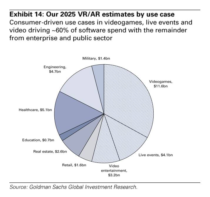 高盛预测,2025 年游戏占 VR/AR 应用市场的 1/3。虽然高盛同意 VR/AR 是下一代“通用”计算平台,但 10 年之后游戏仍是最大用例。