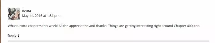 每次的更新都让人惊喜万分:“啥!本周还有额外一章!给你我所有的赞美和感谢!400章左右的故事越来越有趣!”