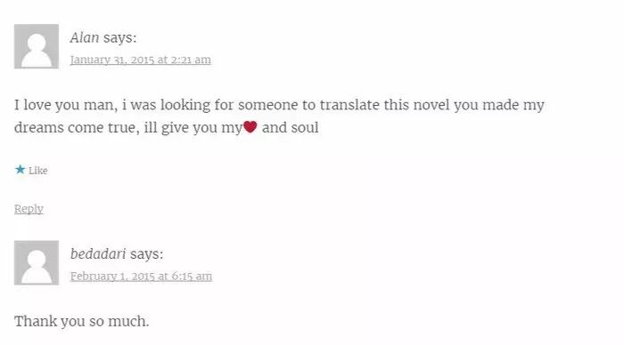 想到以前看到的说法:只有草莓榴莲网的用户素质最高,论坛里都是求种子时“楼主一生平安”的留言;但是Wuxiaworld上更是一片祥和,读者们对翻译的赞美之词不绝于耳,使出浑身解数夸赞翻译,生怕他们不按时更文或者挖坑走人。