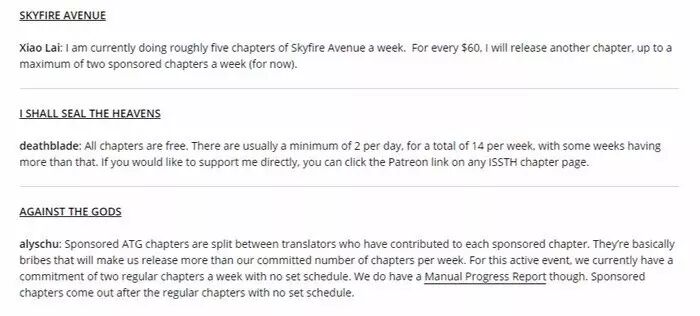 不过大部分翻译都保证了每周免费更新的章节数目——当然这往往还不够塞牙缝的。那么读者怎么办呢?给钱呀!读者可以选择“赞助”翻译,达到一定总数额后他们就会额外更文,不过额外更文也有数量限制。