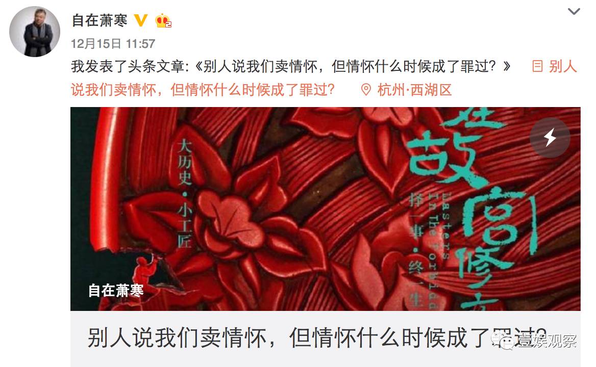 “《我在故宫修文物》这样的题材登陆院线本身就是一个突破。它让我们的院线电影更加多样化。票房不是衡量纪录片这种类型的唯一标准和最终标准,社会影响和内容品质才是。同时,互联网会大大缩短中国纪录片观众的培育,我们对未来有信心。”