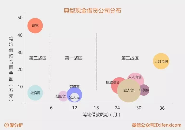 为了更加清晰的分析市场竞争格局,爱分析选取了10家典型个人现金借贷公司的三个重要指标,制作了市场分布图。其中,横轴为笔均借款周期,纵轴为笔均借款合同金额,气泡大小表示贷款余额。