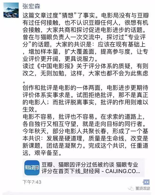 “电影不容易,批评也不容易。在求索的道路上,各自独行又相互守望,就是走向目标的同行者。”电影局局长张宏森在朋友圈说道。