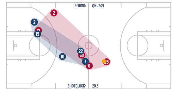 在每个 NBA 的球馆内部的顶端上都有一台追踪球员运动的摄像机,它在追踪球员运动途径的时候可以形成一整套完成的数据,除了基本的得分、助攻数据之外,还可以得到球员的运动范围、触球点、投篮点等详细的数据。