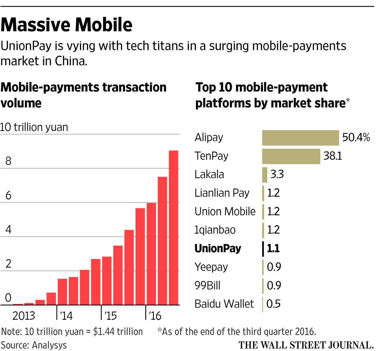相比之下,垄断中国信用卡支付的国有企业中国银联股份有限公司(China Unionpay Co.)只占移动支付市场1%的份额,而中国国有大银行在推出自己的移动支付系统方面进展缓慢。