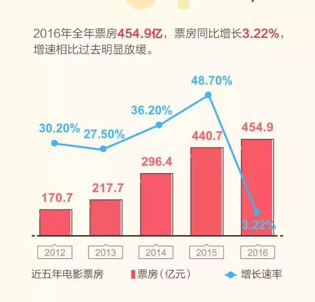 2016年底,中国电影交出了454.9亿票房的成绩单,与年初人们以为这一年会突破600亿票房大关相去甚远,过去几年间,中国电影票房在过去4年里年平均增速为30%,而2016年票房同比增长由双位数跌至个位数,仅为3.22%。