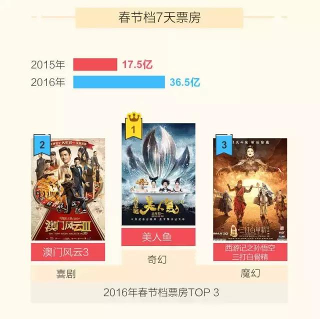 根据淘票票的报告,2016年的春节档成绩斐然,电影《美人鱼》更是在这个档期创造了33以票房的神话。相比之下,其他档期相对惨淡,特别是4、7、9三个月,票房同比下降10亿左右。