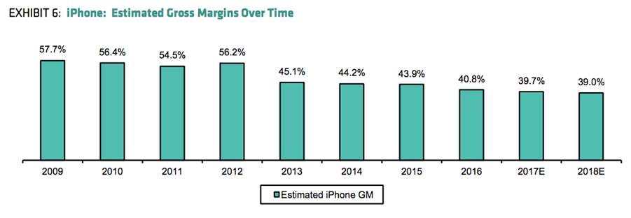 那我们换个思路去考虑,Bernstein分析,iPhone的毛利率并没有随着苹果的品牌价值而提高,反而是越来越多新功能地加入(双摄像头,亮黑),以及OEM厂商竞争,使得BOM(物料价格)只高不低。所以,如果单从盈利角度去想,只有研发和维护成本地软件服务,似乎比硬件销售更吸引投资人。