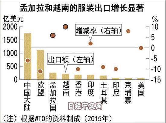 据世界贸易组织(WTO)统计显示,中国的服装出口额2015年达到1750亿美元。虽然占到世界的4成,但出口额本身比2014年减少6%。另一方面,孟加拉、越南和柬埔寨等国正在增长。这被认为是将服装生产从中国转移至新兴市场国家的生产基地的结果。