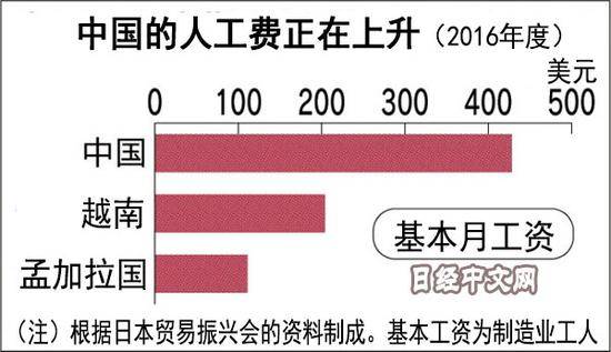 这种趋势出现的背景是中国的人工费上升。据日本贸易振兴机构(JETRO)统计显示,截至2016年度,中国的每月的人工费已突破400美元,达到作为竞争对手崛起的越南的2倍、孟加拉国的4倍的水平。今后中国的人工费预计维持每年10%以上的增速,从中国迁走的服装企业正在增加。