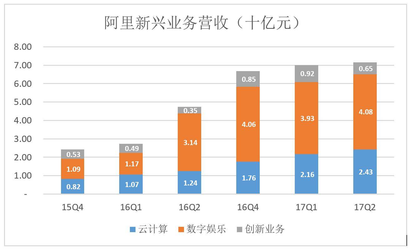 2017年Q2,数字娱乐、云计算业务营收分别达到40.8亿和24.3亿。