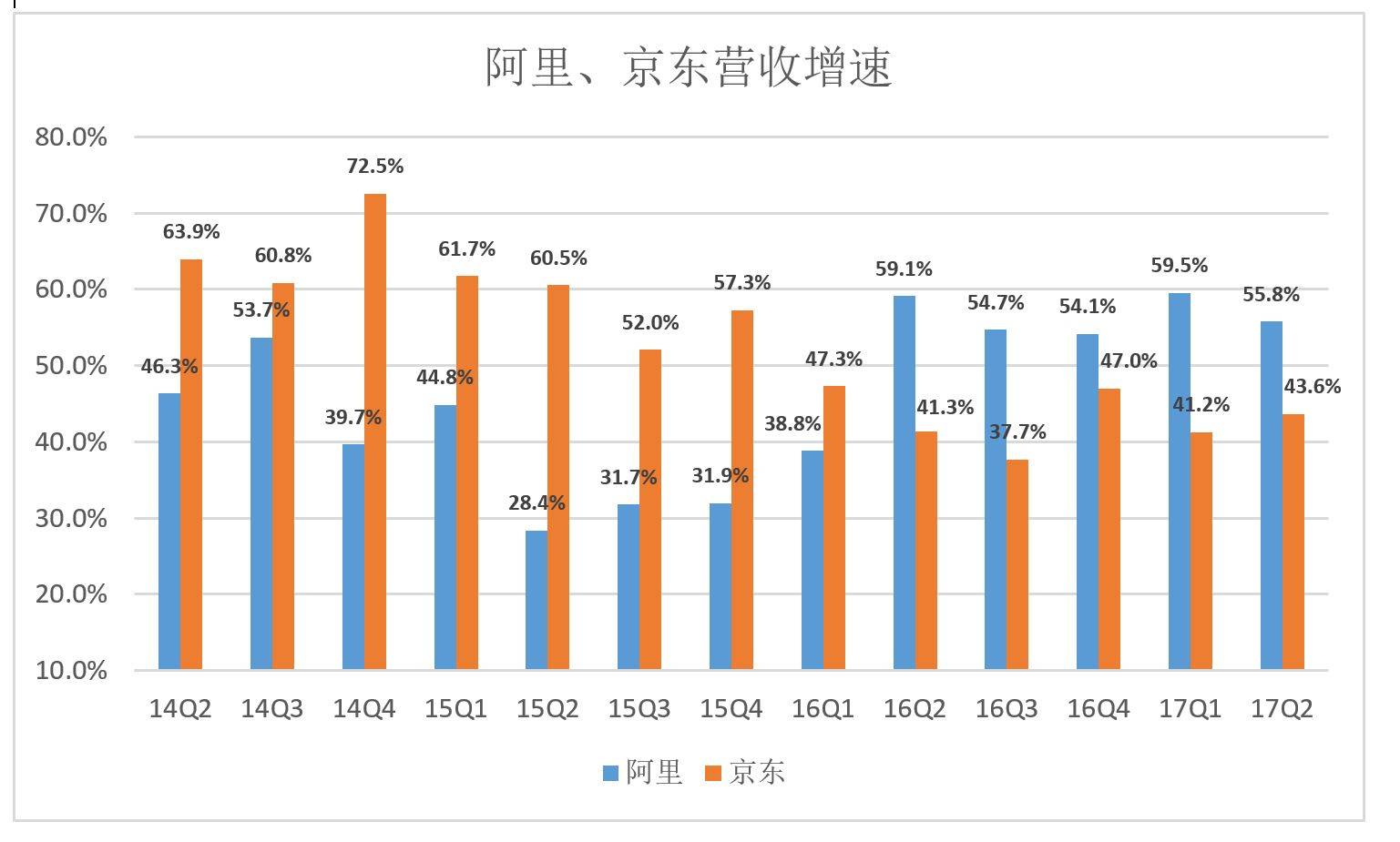 值得注意的是,京东亦积极进行多元化探索,但营收增速从2016年Q2开始已连续5个季度落后于阿里。2014年Q2,京东营收同比增速达63.9%,阿里为46.3%;两年后的2017年Q2,京东、阿里营收同比增速分别为43.6%和55.8%。