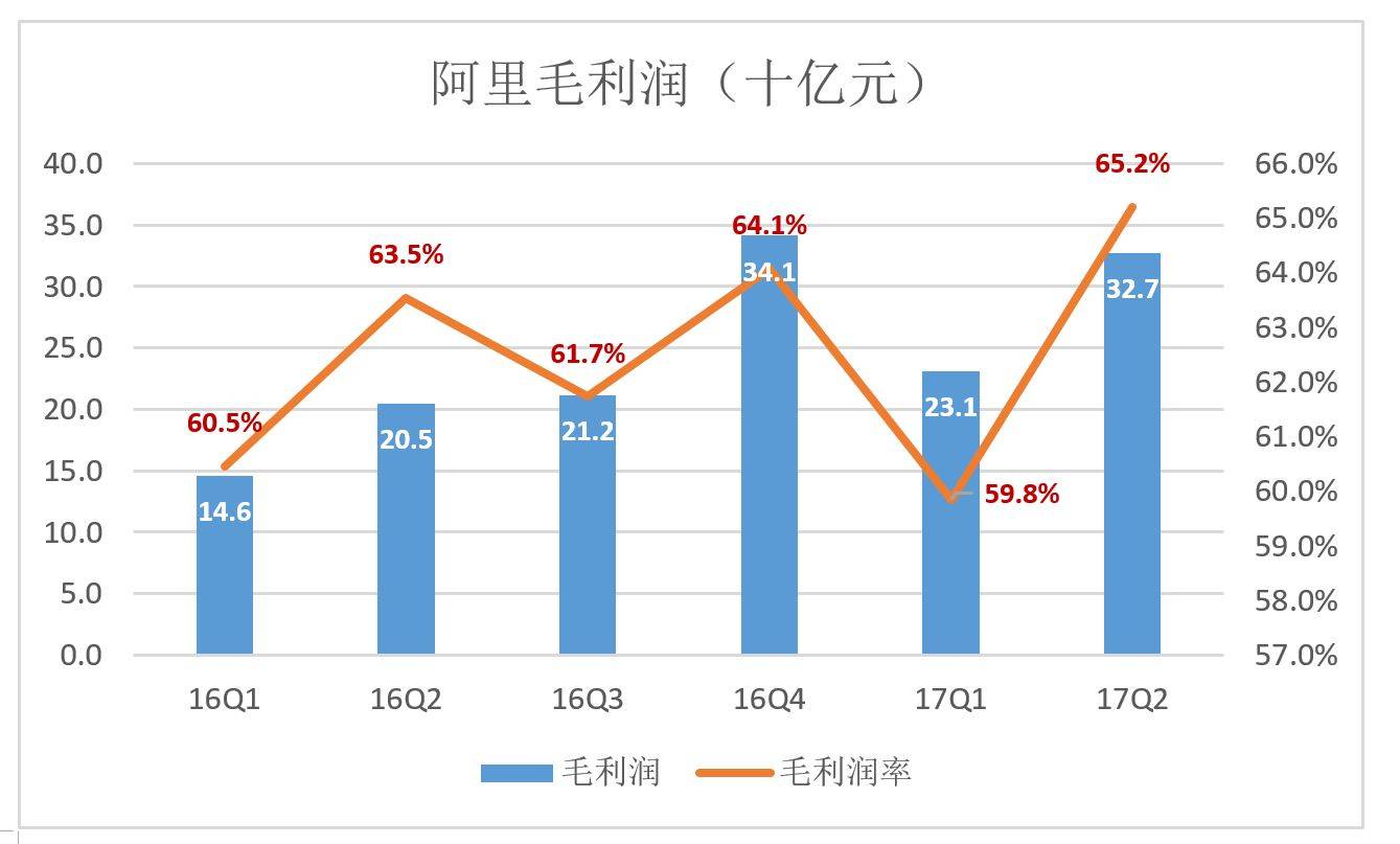第一,毛利润率周期波动,却维持在高位。阿里毛利润率峰值出现在Q2、Q4,2016年Q2为63.5%,2017年Q2达65.2%。