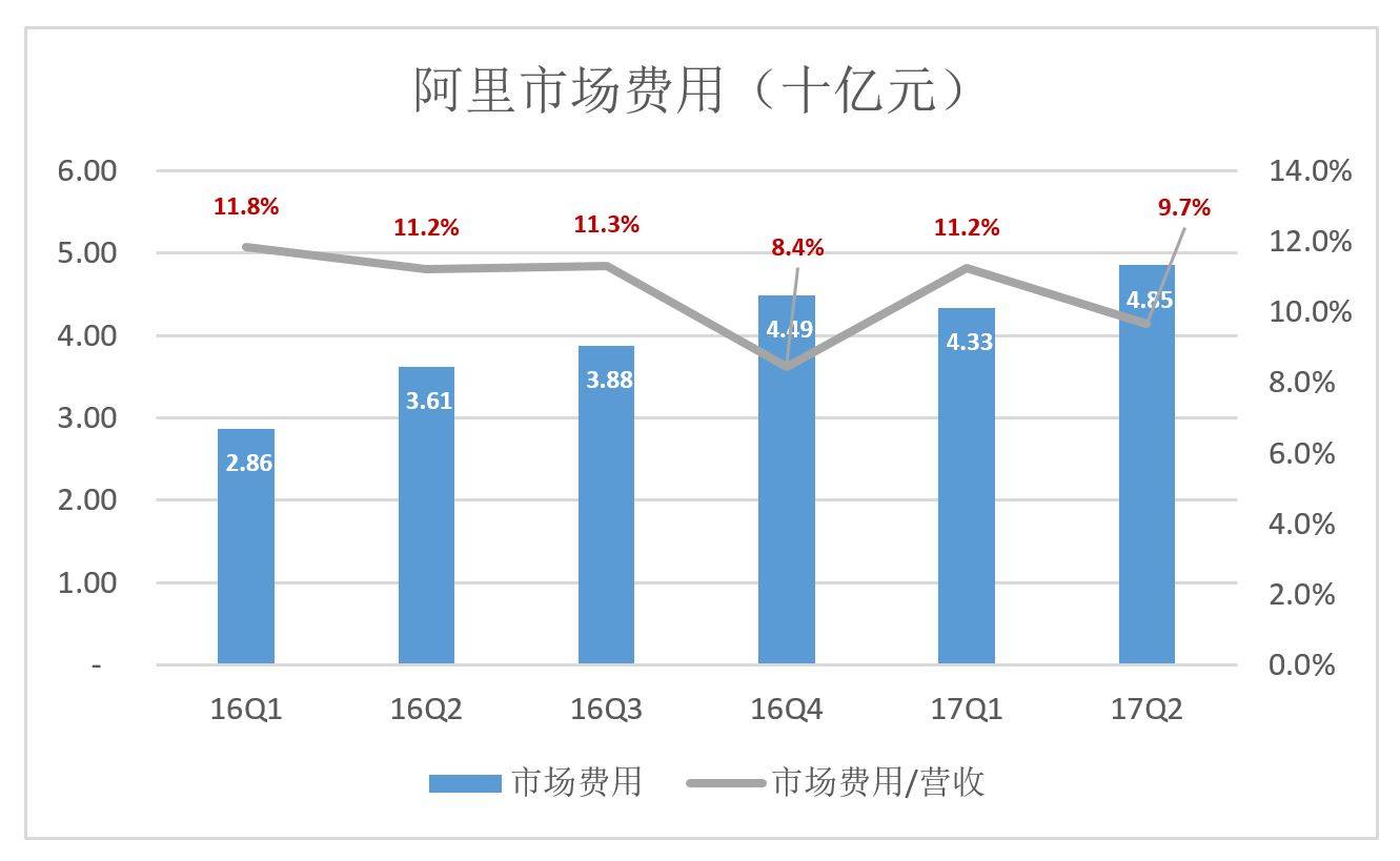 第二,市场费用增速慢于营收且占营收比例呈下降趋势。2017年Q2,阿里市场费用为48.5亿,同比增长34.2%,远低于56%的营收增速。市场费用占营收的9.7%,较2016年Q2低1.5个百分点。