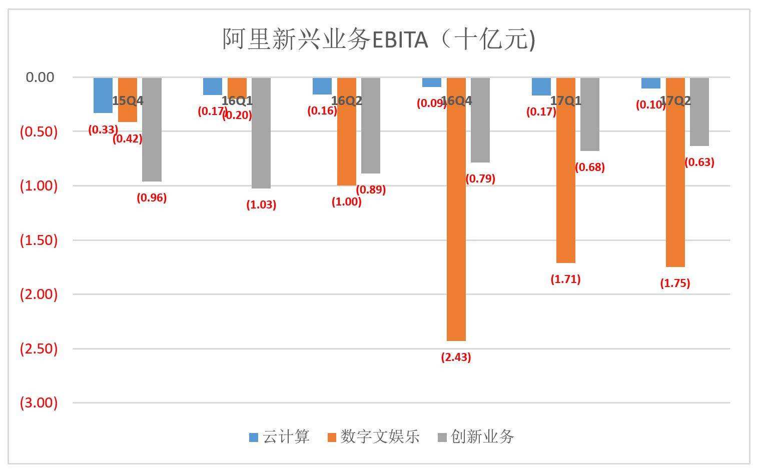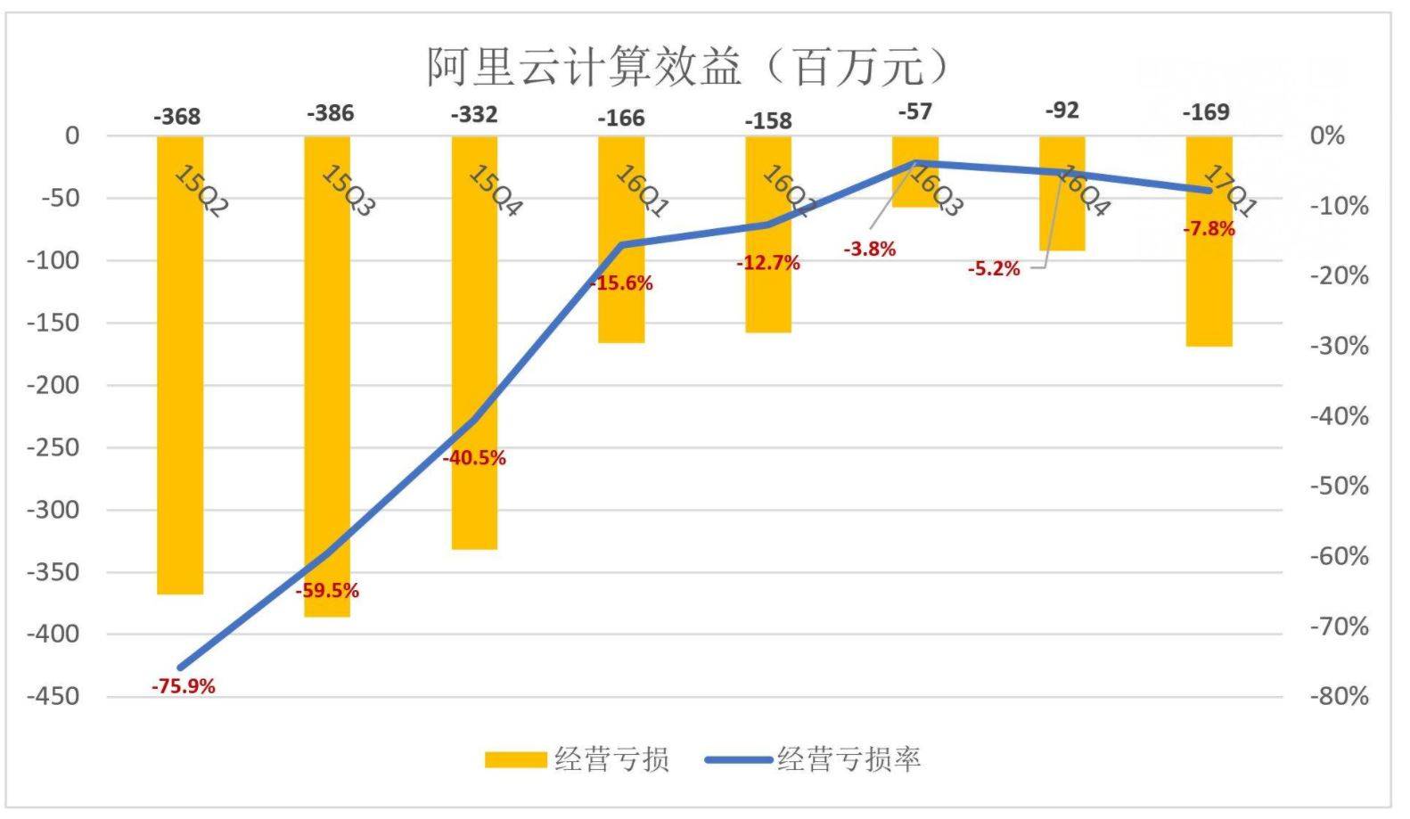 比如云计算业务的EBITA亏损,2015年Q2亏损3.68亿;2016年Q1降至2亿以下,2017年Q2收窄至1.03亿。