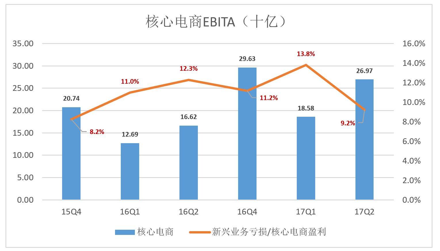 2017年Q2,三大新兴业务的EBITA亏损合共相当于核心电商EBITA的9.2%,盈亏相抵后总EBITA为235.2亿,利润率达47%(EBITA)。