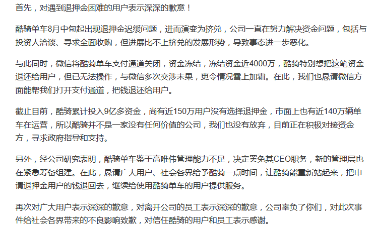 但这个决定只能让退款的问题变得更棘手。无奈之下,酷骑终于出了个公告,道了歉、开了CEO,并把矛头指向了微信: