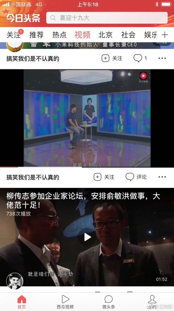 让王利芬愤慨和抨击的西瓜视频是今日头条旗下的短视频项目。根据她发的多张截图,在今日头条的视频栏(见上图),今日头条未经优米方面知情和同意,把优米的采访视频上传到西瓜视频,并在视频右上角打上了西瓜视频的水印。这些视频都是优米采访了王石、雷军、史玉柱、冯仑等企业家,属于优米独家付费内容。王利芬说“这还只是这几天的一小部分”。