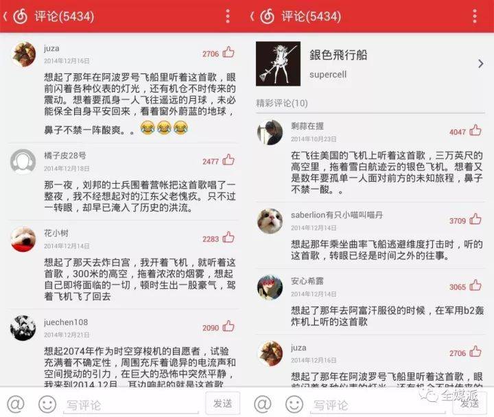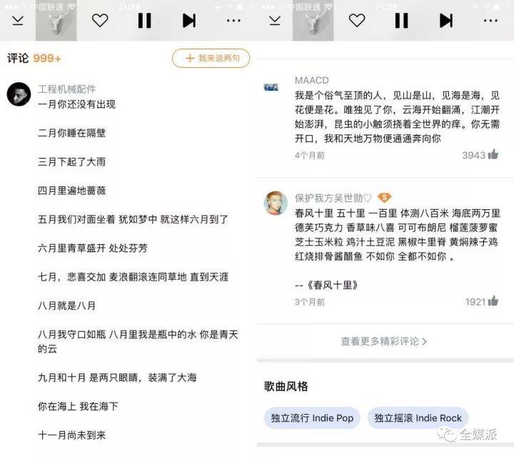 和音乐软件们独特的UGC生产环境有关,这里触发的内容生产,很少会同步出现在微博/朋友圈等个人社交媒体上。或许对于评论者而言,一个基于兴趣的陌生同好圈层,与暴露在熟人目光之下相交,前者更有安全感。