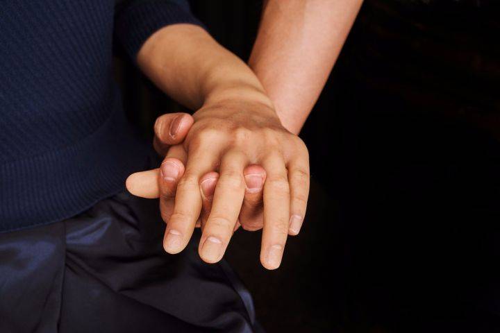 这双放在大腿上的手摸起来很有弹性,但是当你贴近一点,可能就会听到马达发出的声音,而且在它每次眨眼时都可以听到“咔哒”的声响。