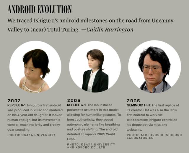 十几年来的研究进展带石黑浩饶了一个大圈:从他小女儿的人形机器人再到另一个外表空洞的幼儿机器人,它可以是任何人的小孩。一个人形机器人,其外观使人感到最生而直接的害怕,且令人印象深刻:一旦它投入运转,你就会被它吸引、与它配合,就会忍不住想要爱护它。